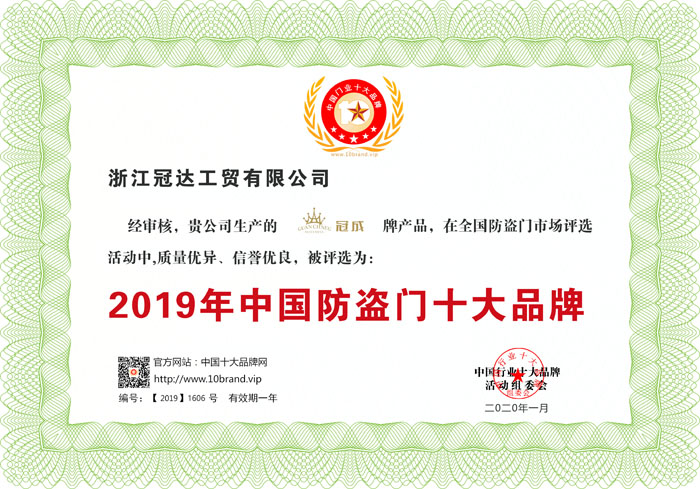 近日,由“中國十大品牌網”舉辦的2019年中國門業十大品牌榜單隆重揭曉。浙江冠達工貿有限公司憑借著在產品、服務以及技術上的領先優勢,榮獲2019中國防盜門十大品牌的獎項。此次評選是根據企業在國內市場的占有率、質量狀況、售后服務體系及品牌形象與美譽度等各個方面進行綜合評定,力求做到客觀、公正、公平。 “門業十大品牌”可謂所有獎項中皇冠上的明珠,問鼎其中一項,對于每個企業而言都是實力的見證。